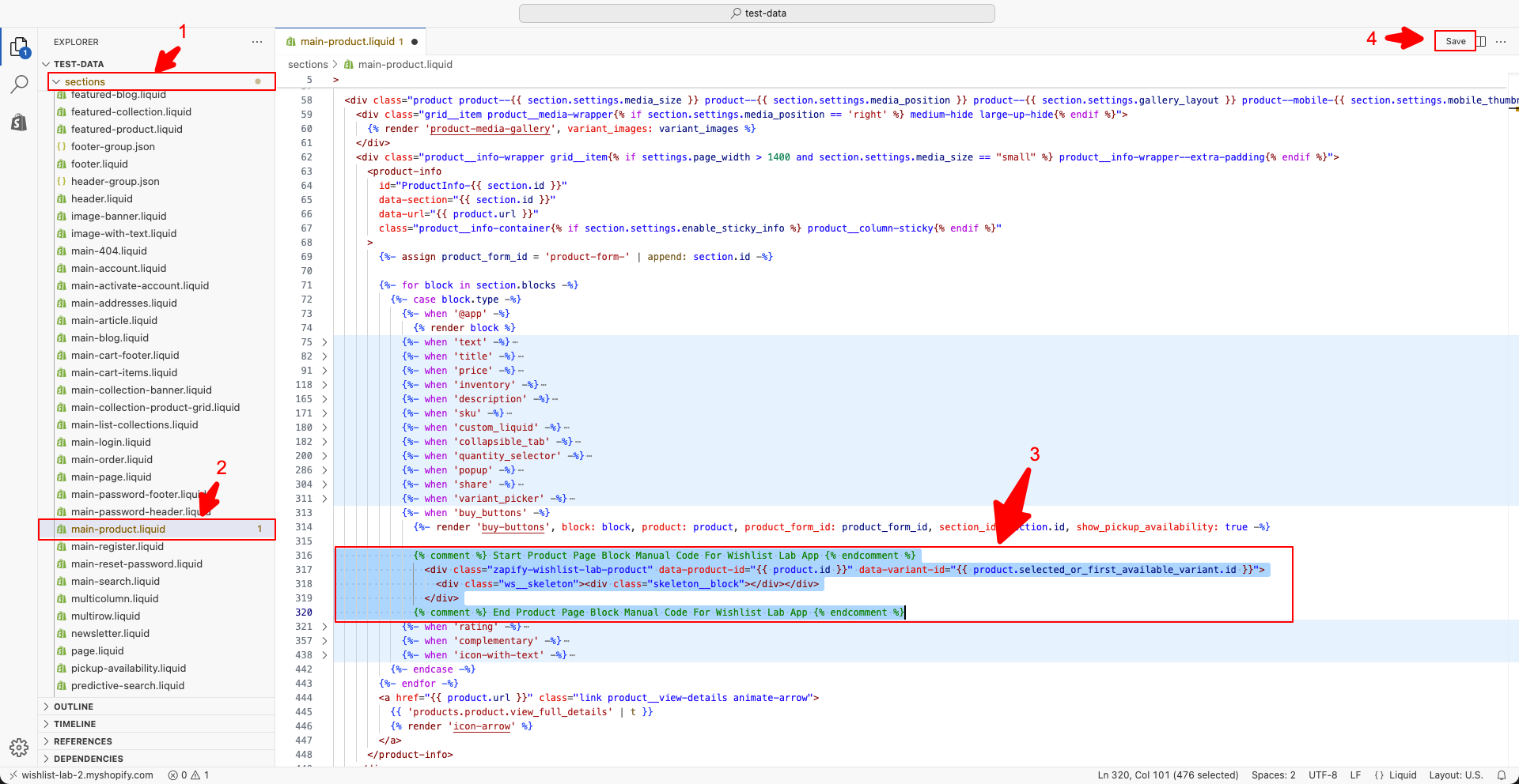- Open Sections → main-product.liquid (or your theme’s main product section).