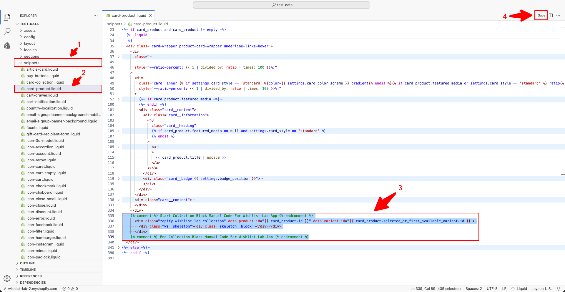 - Paste the collection page button code from the app into the desired position for each product card. Save.