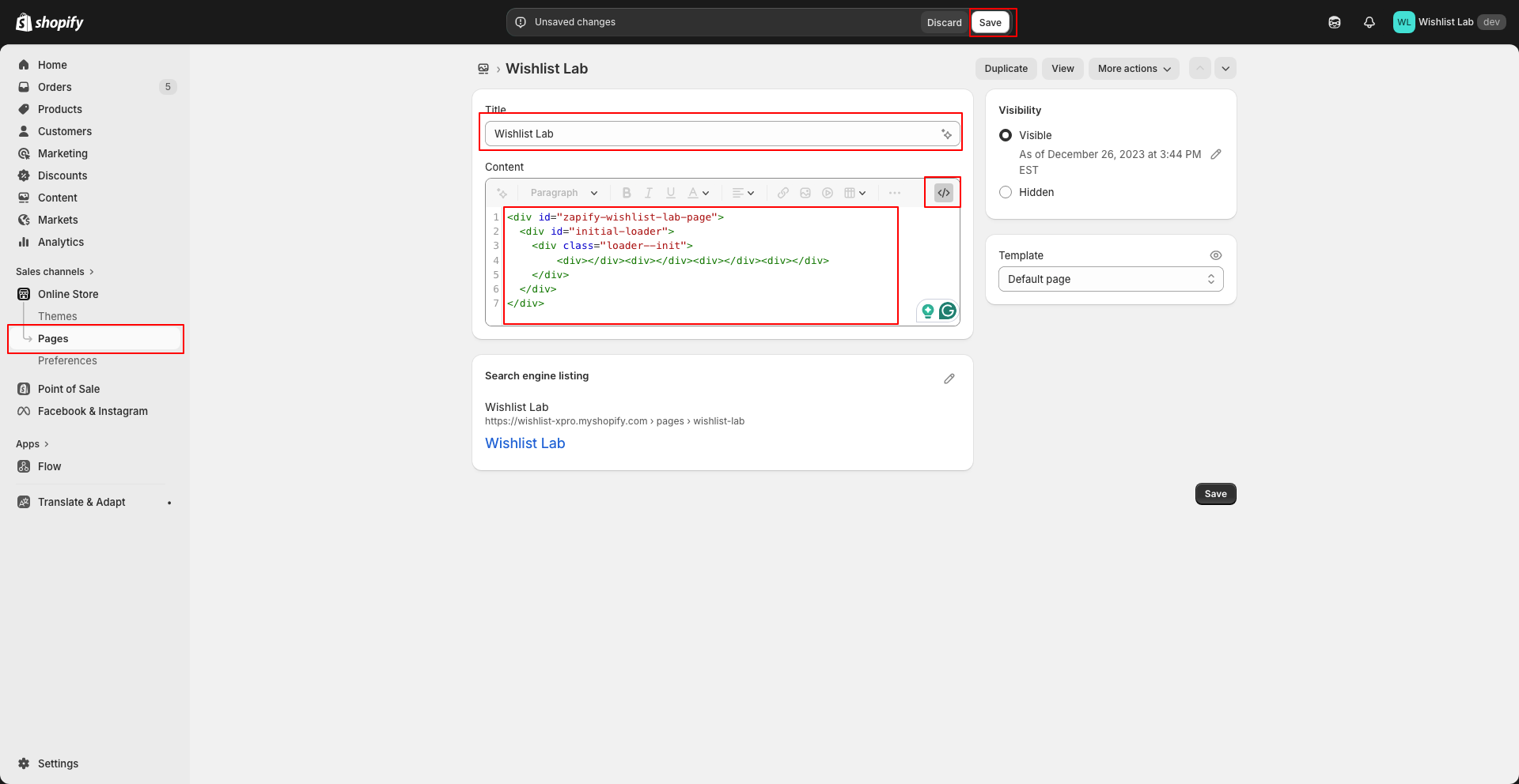 - Create a new Page in Shopify (e.g. “Wishlist Lab”) and click on the "Show HTML" block inside the content section.