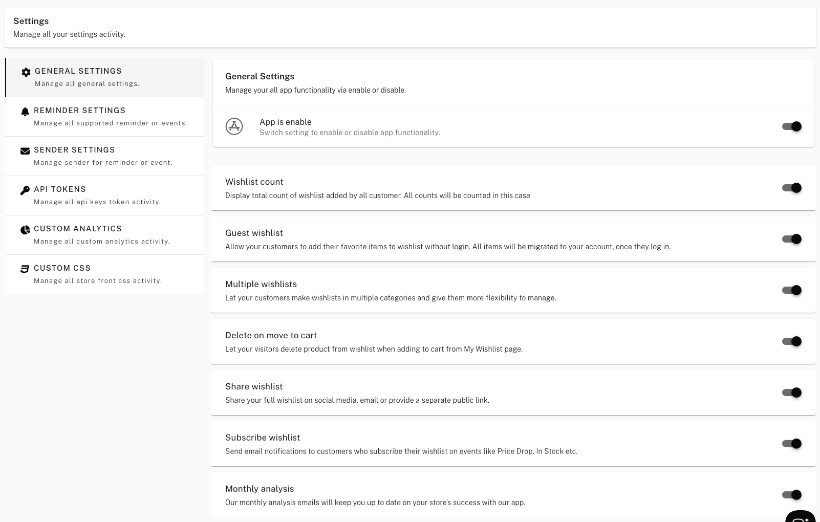 General Settings control whether the app is on and which wishlist features are enabled. Use this page to turn the app on or off and to enable options like guest wishlist, multiple wishlists, and email reminders. Some options depend on your plan.
